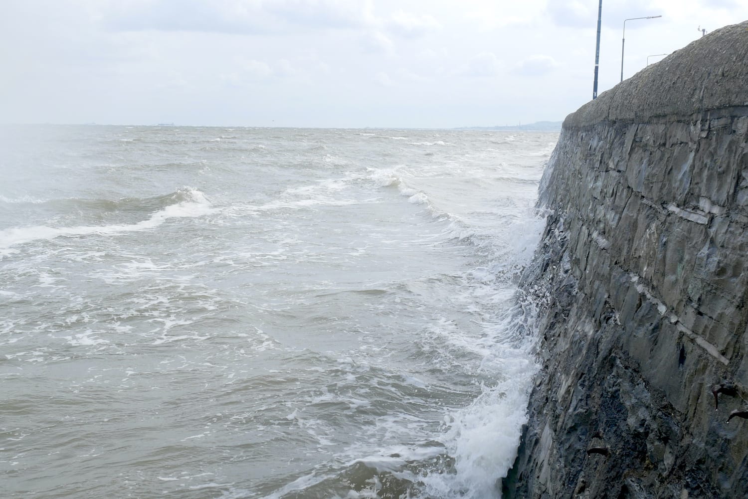 It’s around high tide, and though the sea is comfortably below the top edge of the wall, as bigger waves smack against the barrier, they send cold spray over and onto the footpath.