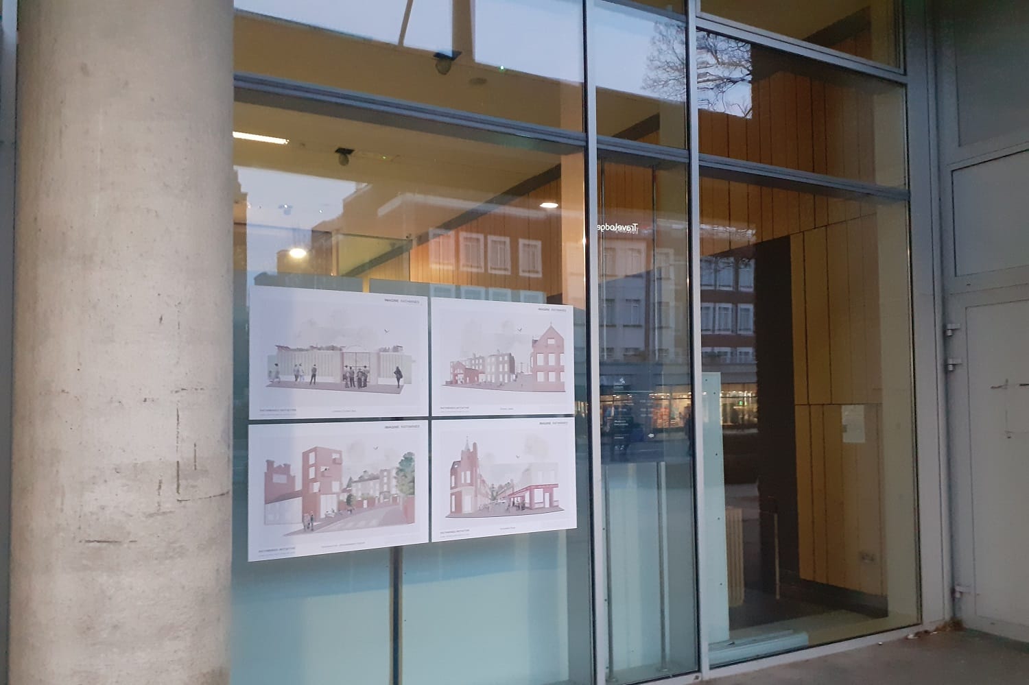The four panels to the right of the entrance to the Swan Leisure centre show four places in Rathmines where the group thought there could be improvements, says Kelly, standing in front of them.