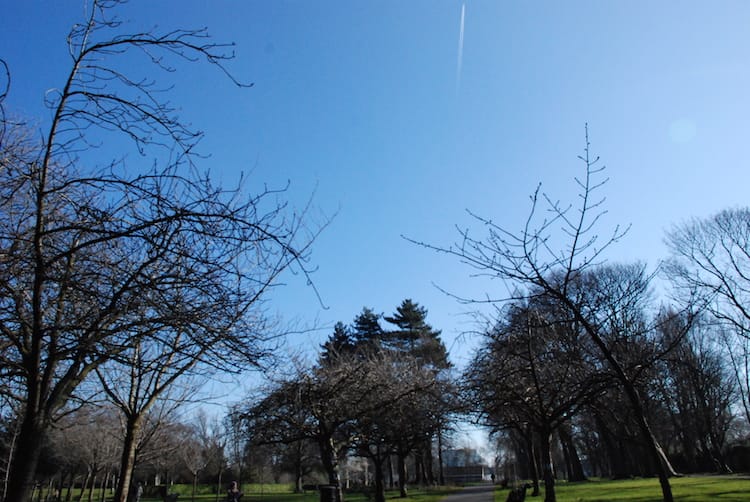 Bare birches cast long shadows over Herbert Park in Ballsbridge.
