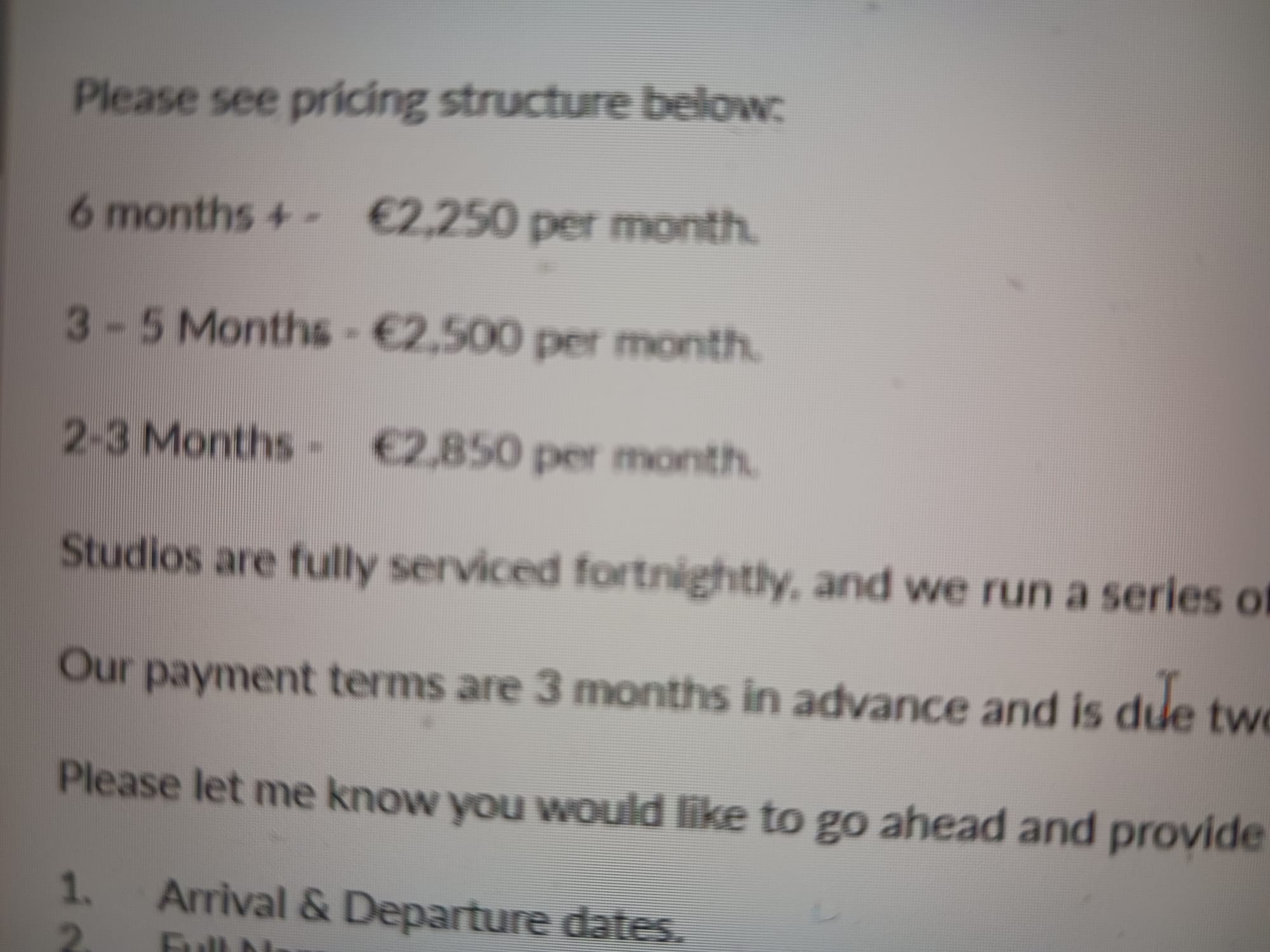 He could book two or three months for €2,850 a month, said a Niche Living manager, in an email. Or, three to five months for €2,500 a month, or six months or more for €2,250 a month.