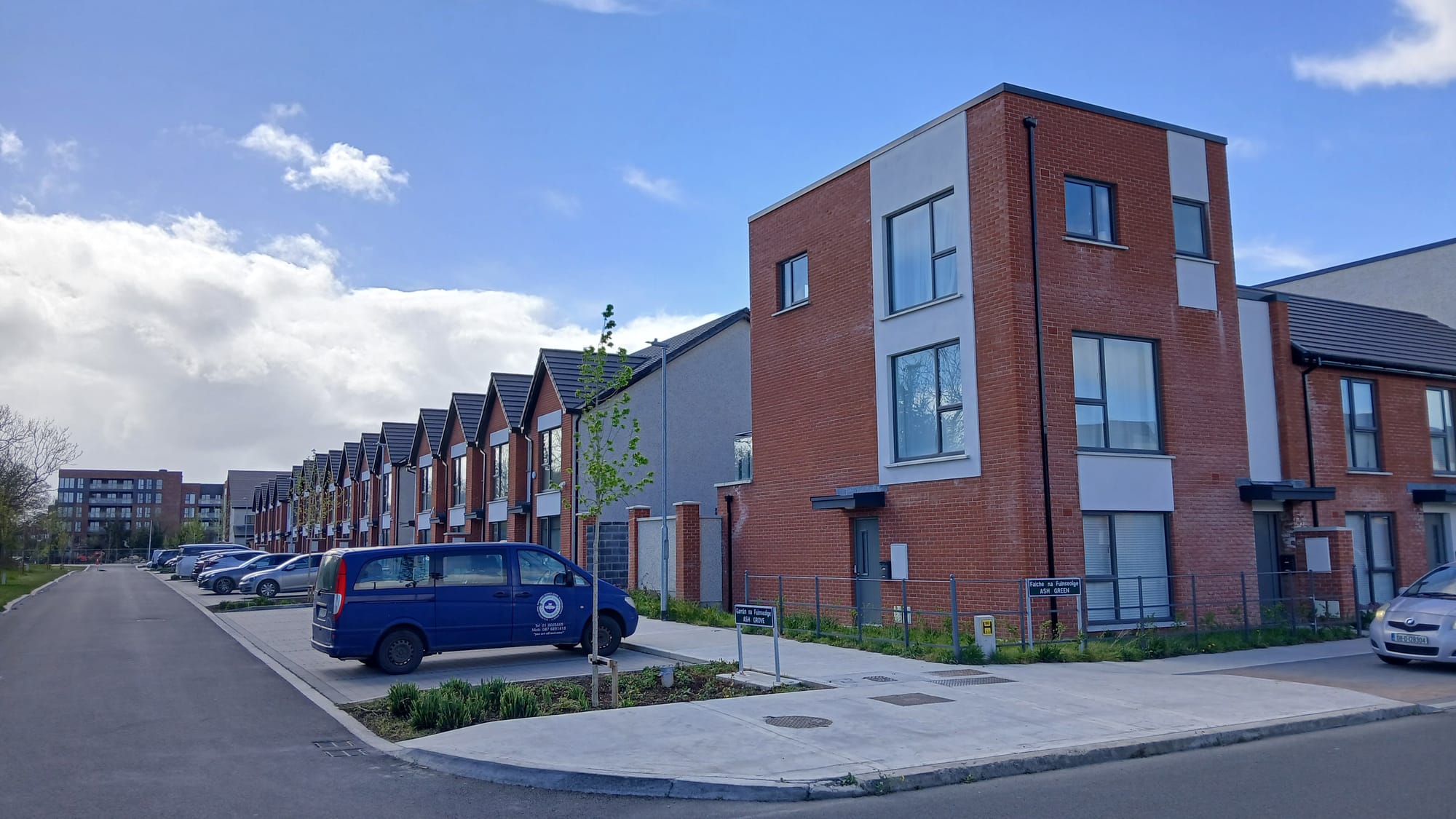 Many new housing schemes, including another massive development nearby at Seven Mills, have communal parking. But communal spots don’t work well with electric charging, Mathew said.