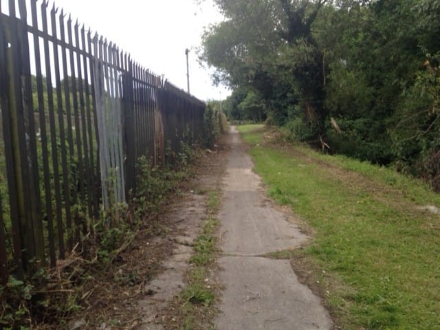 The neglected track is lined with an ugly metal fence, which spoils the wooded riverbank to the south.