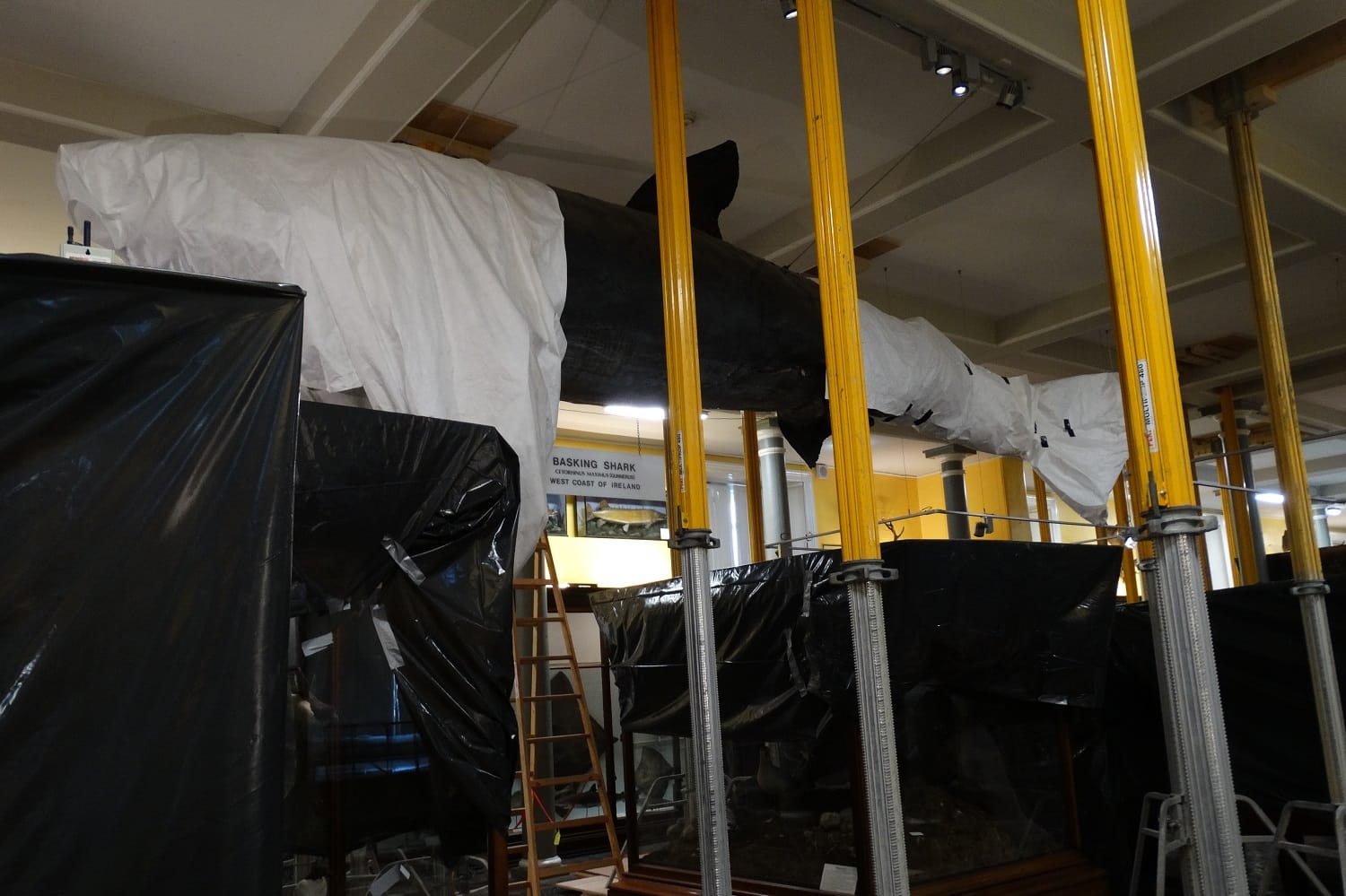 A 20-foot basking shark hangs overhead, its dark blue leathery skin also draped in protective cloth.