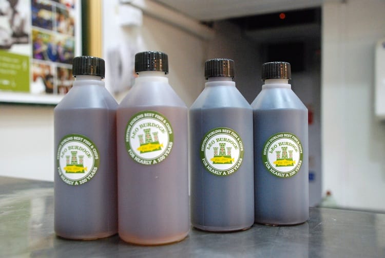 Leo Burdock’s produce their own. One batch is 20 litres, which will last the shop a day, says Salmon. For customers who want to take some home, they sell smaller bottles of it for €2 each.