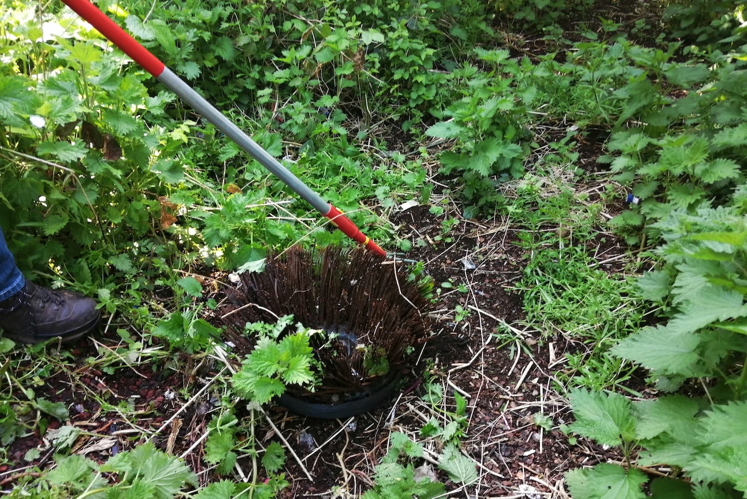 Nearby, he picks up a large metal brush. “That is a road sweeper brush,” he says. “Nobody put that here but the council.”
