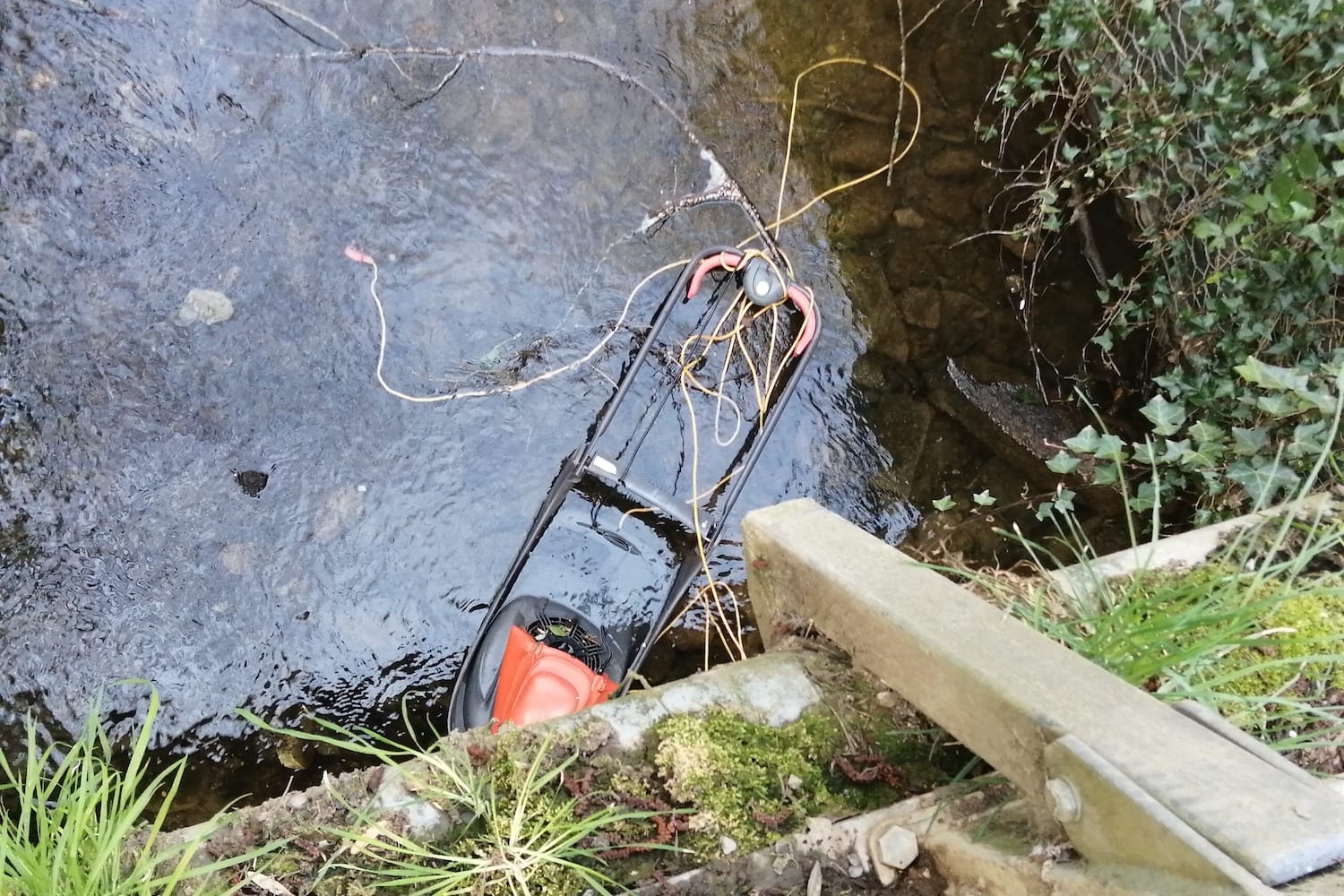 In the river itself there is a lawn mower. There are no signs asking people not to litter or to deter illegal dumping.