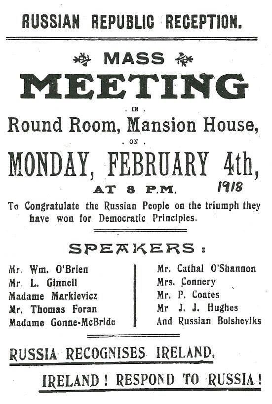 Among those to address the crowd were Maud Gonne and Countess Markievicz. The latter congratulated the Bolsheviks on behalf of the Irish Citizen Army, which less than two years earlier had taken part in the Easter Rising.