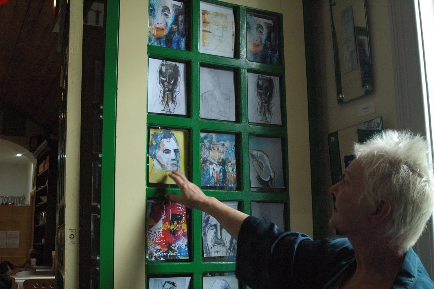 Behind her is an old cream and green telephone box with its glass windows covered by 20 different prints, showing smaller versions of Carroll’s paintings, some of which hang elsewhere in the cafe.