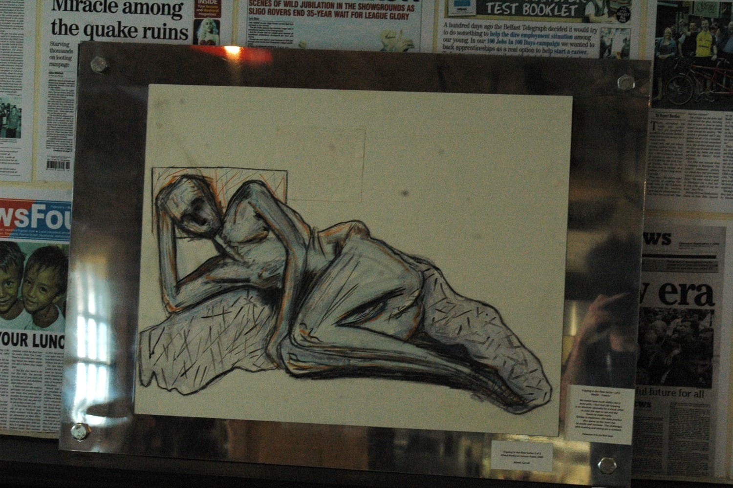 On the walls are faces, distorted and almost ghostly, with solemn expressions, and closed eyes. Many of the works are framed between a sheet of glass and a plate of aluminium.