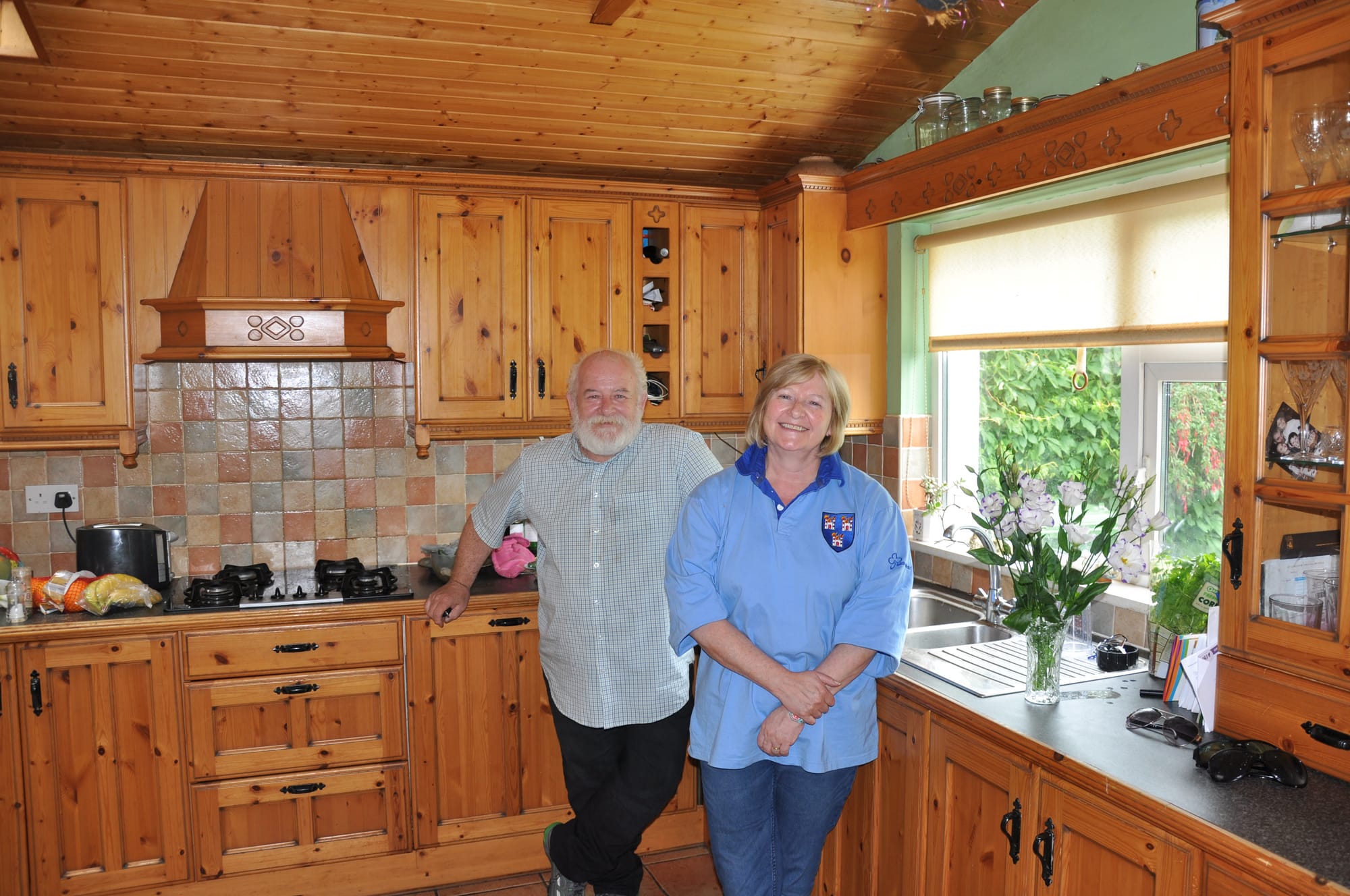Brendan sits at a large table in the centre of a bright, wood-paneled kitchen. Ellen sits in a chair by the glass doors that open out onto their garden.