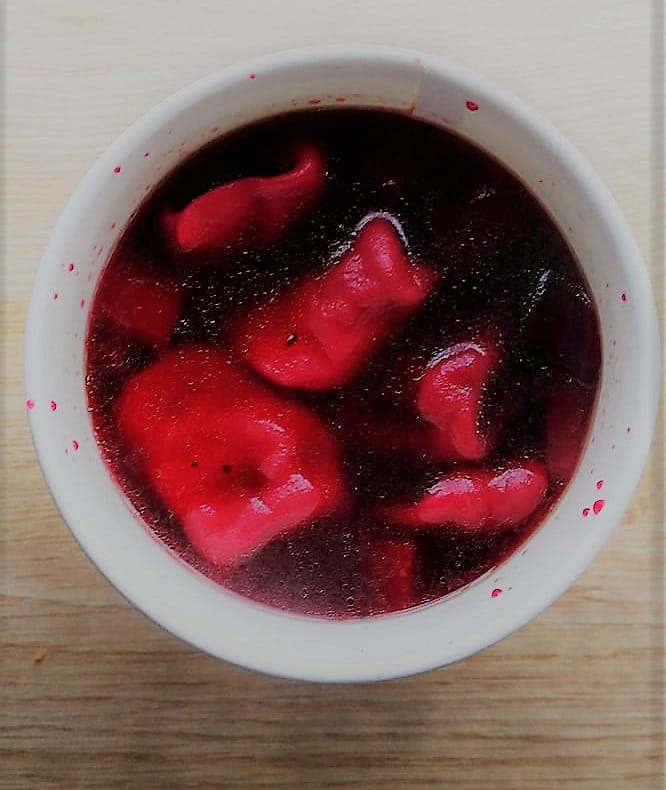 Kowalczyk ladles out some beetroot borscht with small mushroom dumplings for a customer who has come up to the truck window. The soup is sweet from fresh beetroot, and the dumplings are salty and rich.