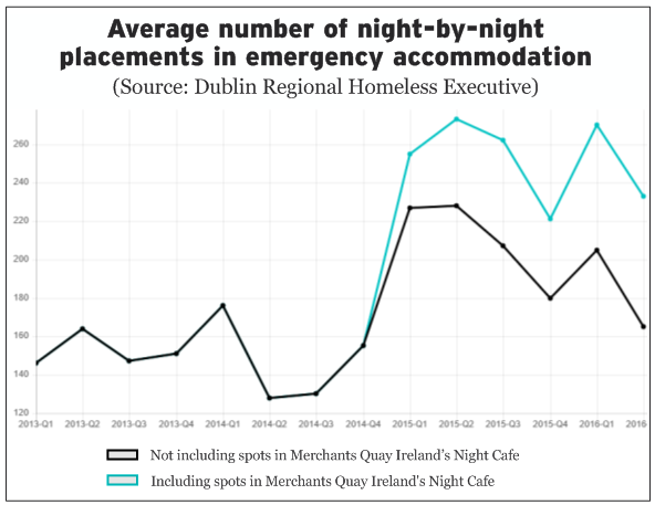 It depends a bit how you count, though. If you add in the places at the Night Cafe run by Merchant’s Quay Ireland, then there were 270 people each night on average in the first quarter of 2016, and 233 on average in the second quarter of 2016.