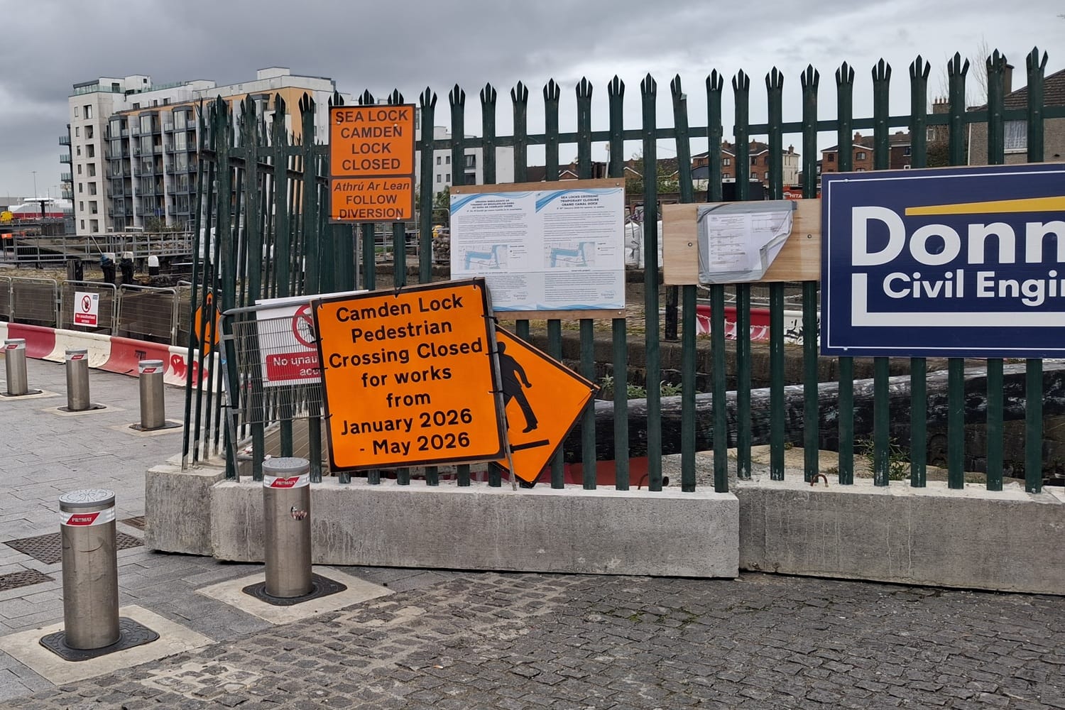 The Camden Lock Pedestrian Crossing was closed for works from January 2026 to May 2026, read an orange sign fixed to green fences, which were held down by long concrete blocks.