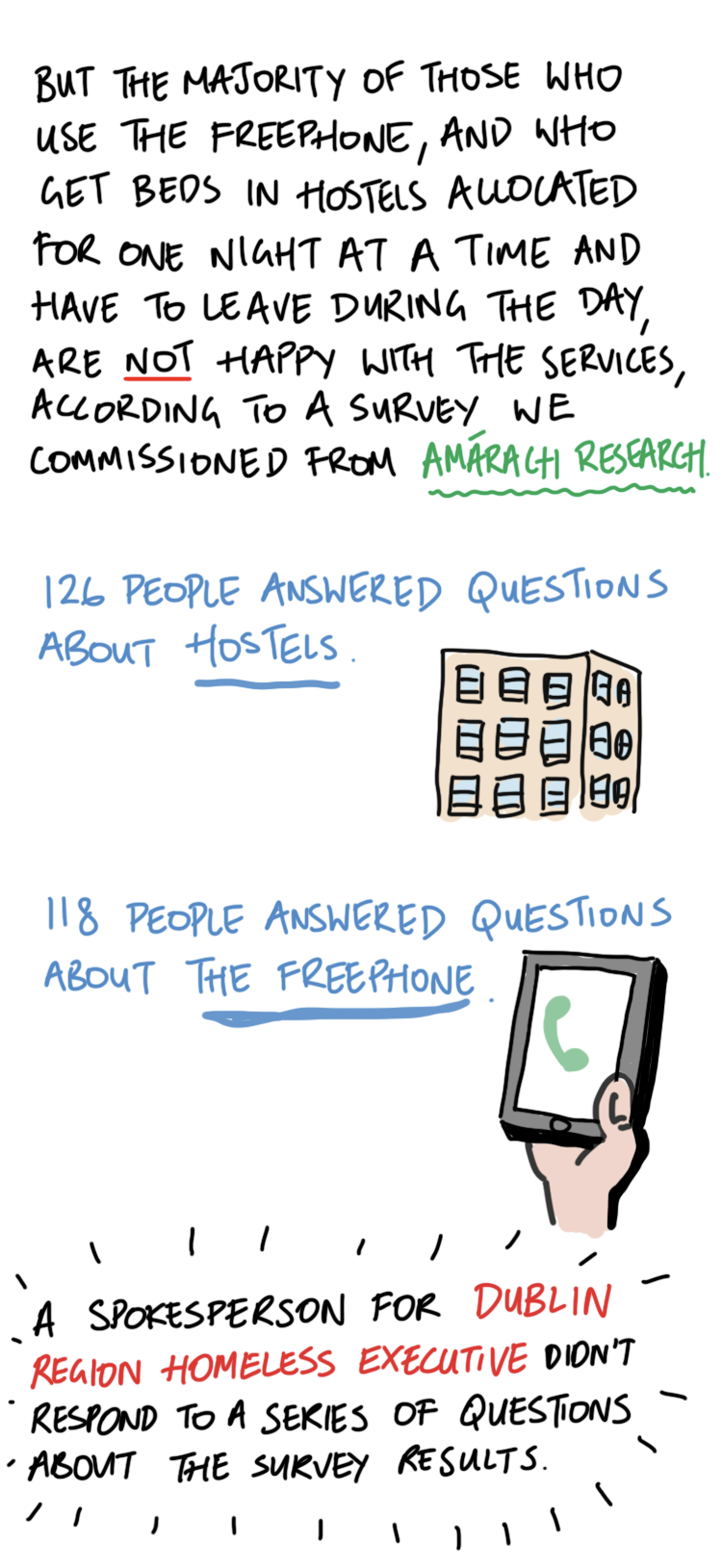 A survey funded by our readers and conducted by Amárach Research asked about issues including how often people call the freephone and can’t get a bed for the night, and the conditions in the hostels when they do get in.
