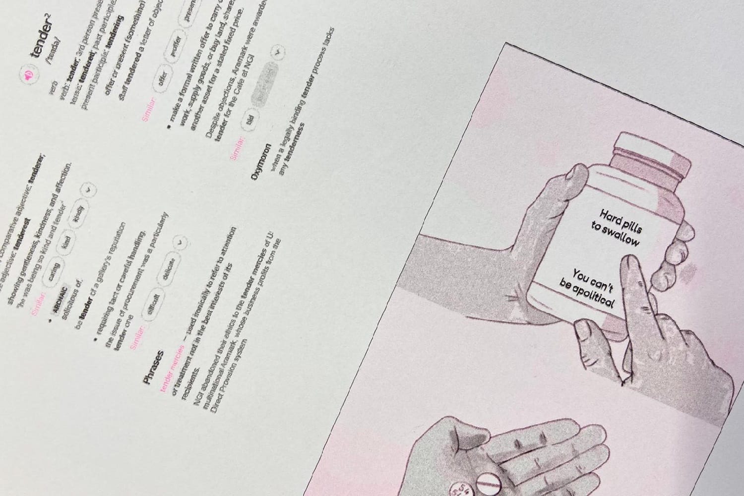Another card plays around with dictionary definitions of the word “tender”, using example sentences such as “NGI abandoned their ethics to the tender mercies of US multinational Aramark.”